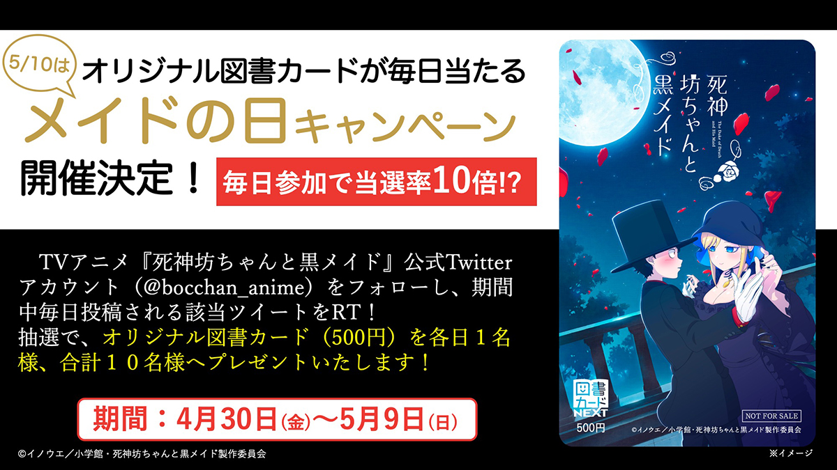 5月10日の「メイドの日」を記念し、TVアニメ『死神坊ちゃんと黒メイド』オリジナル図書カードが当たるプレゼントキャンペーンを10日間連続で開催!