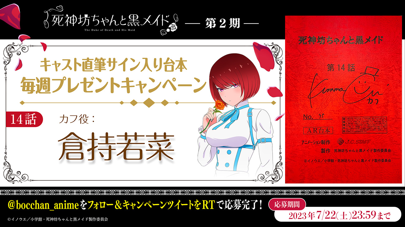 『死神坊ちゃんと黒メイド』第2期第2話(第14話)の放送を記念して、第14話のキャストサイン入り台本が当たるTwitterフォロー&RTキャンペーンを実施します!貴重なアイテムが手に入るチャンスをお見逃しなく!