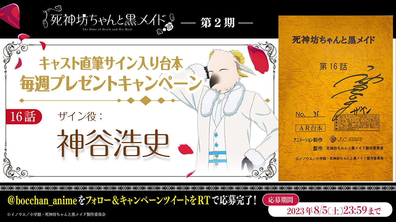 『死神坊ちゃんと黒メイド』第2期第4話(第16話)の放送を記念して、第16話のキャストサイン入り台本が当たるTwitterフォロー&RTキャンペーンを実施します!貴重なアイテムが手に入るチャンスをお見逃しなく!