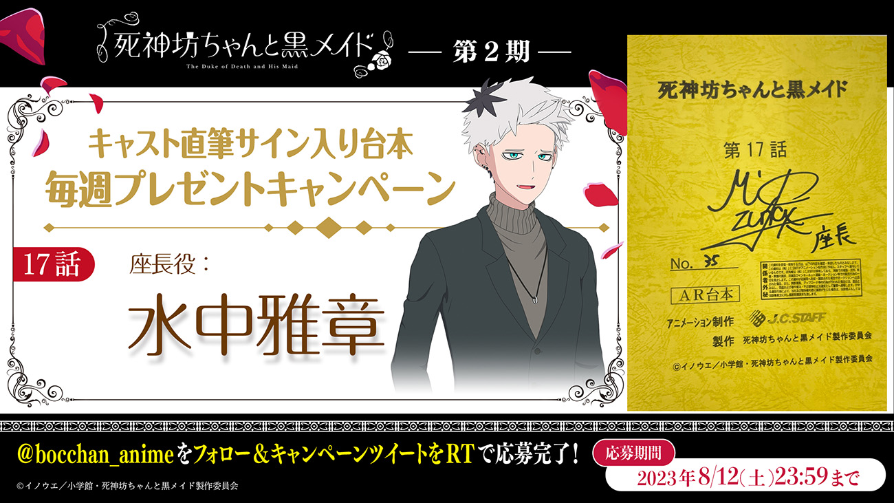『死神坊ちゃんと黒メイド』第2期第5話(第17話)の放送を記念して、第17話のキャストサイン入り台本が当たるTwitterフォロー&RTキャンペーンを実施します!貴重なアイテムが手に入るチャンスをお見逃しなく!