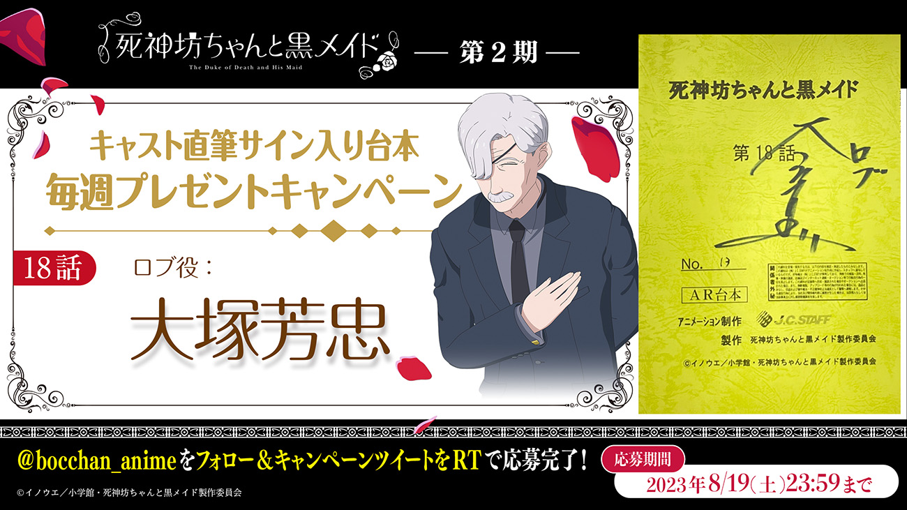 『死神坊ちゃんと黒メイド』第2期第6話(第18話)の放送を記念して、第18話のキャストサイン入り台本が当たるX(Twitter)フォロー&RTキャンペーンを実施します!貴重なアイテムが手に入るチャンスをお見逃しなく!