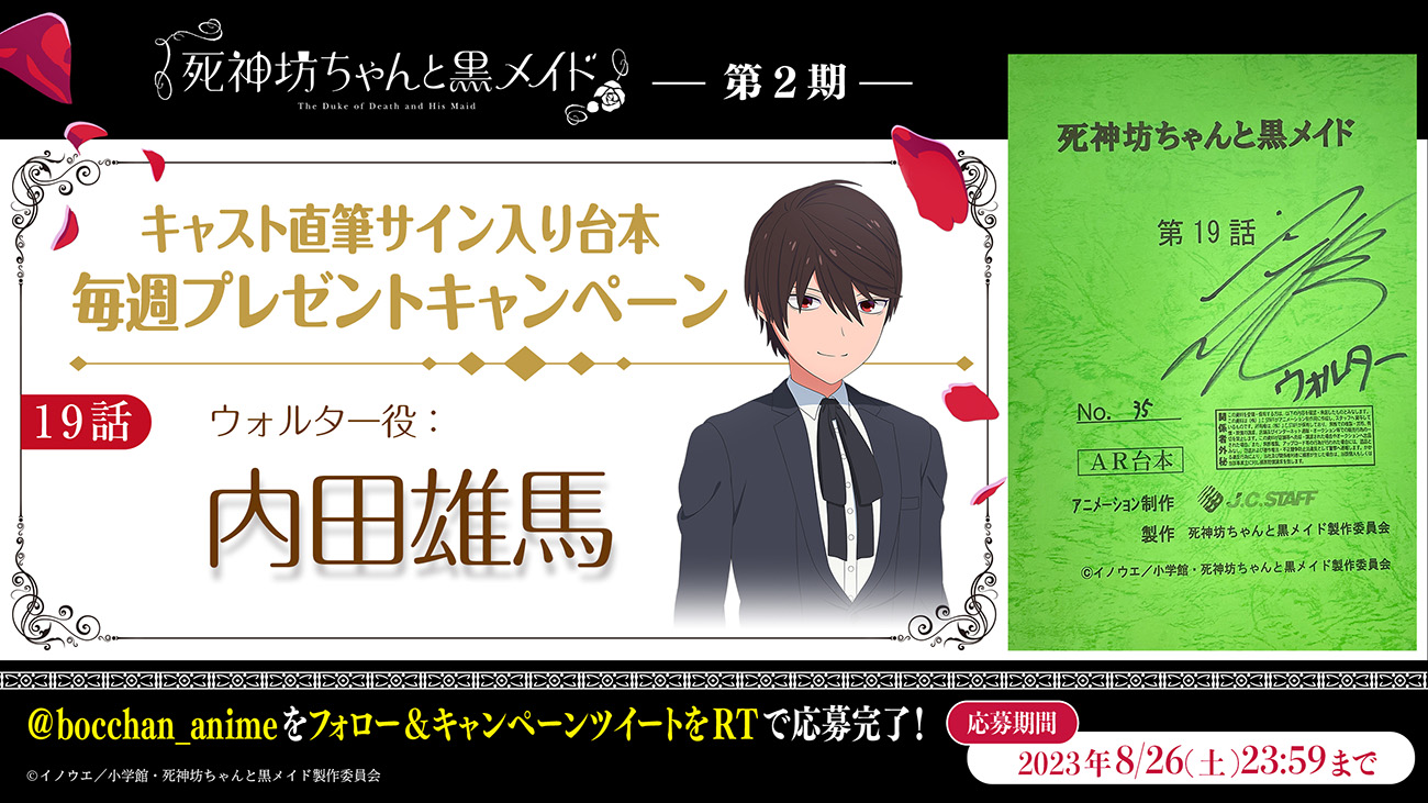 『死神坊ちゃんと黒メイド』第2期第7話(第19話)の放送を記念して、第19話のキャストサイン入り台本が当たるX(Twitter)フォロー&RTキャンペーンを実施します!貴重なアイテムが手に入るチャンスをお見逃しなく!