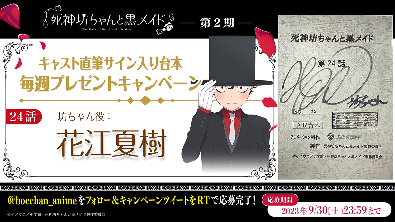『死神坊ちゃんと黒メイド』第2期第12話(第24話)の放送を記念して、第24話のキャストサイン入り台本が当たるX(Twitter)フォロー&RTキャンペーンを実施します!貴重なアイテムが手に入るチャンスをお見逃しなく!