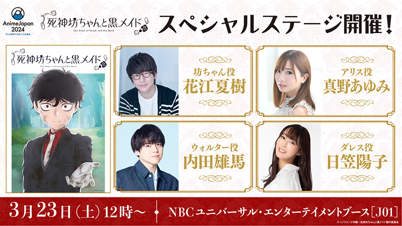 | 【観覧方法】 | 会場での現地観覧、配信観覧 ※詳細はAnimeJapan 2024 NBCユニバーサルブース特設サイト(https://www.nbcuni.co.jp/anime/anime-japan/2024/)をご覧ください。 |