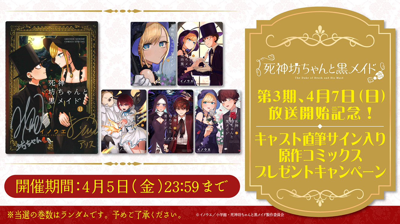 | 【応募方法】 | 『死神坊ちゃんと黒メイド』公式X(Twitter)アカウント(@bocchan_anime)をフォロー後、公式X(Twitter) から3月23日(土)に投稿された応募ツイートをリツイートしていただいた方の中から抽選でプレゼントいたします。 |
