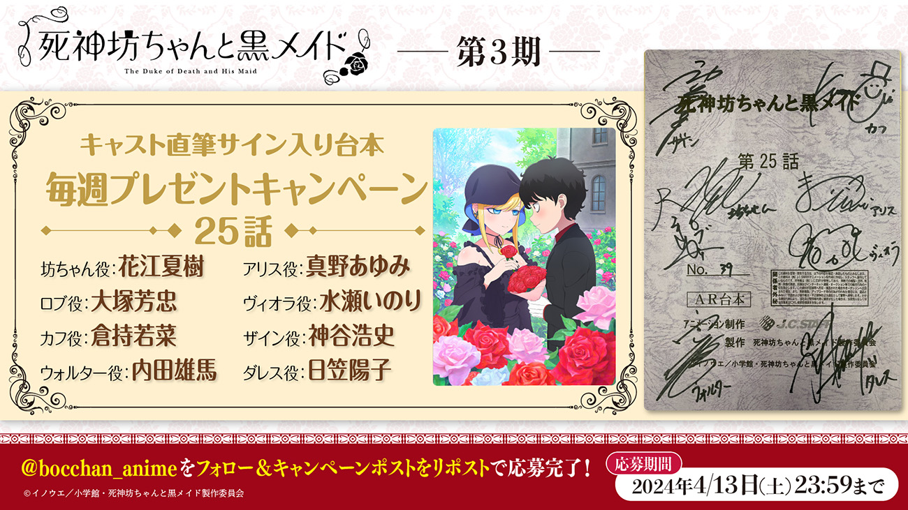 | 【応募方法】 | 『死神坊ちゃんと黒メイド』公式Xアカウント(@bocchan_anime)をフォロー後、公式Xから4月7日(日)に投稿された応募ポストをリポストしていただいた方の中から抽選でプレゼントいたします。 |