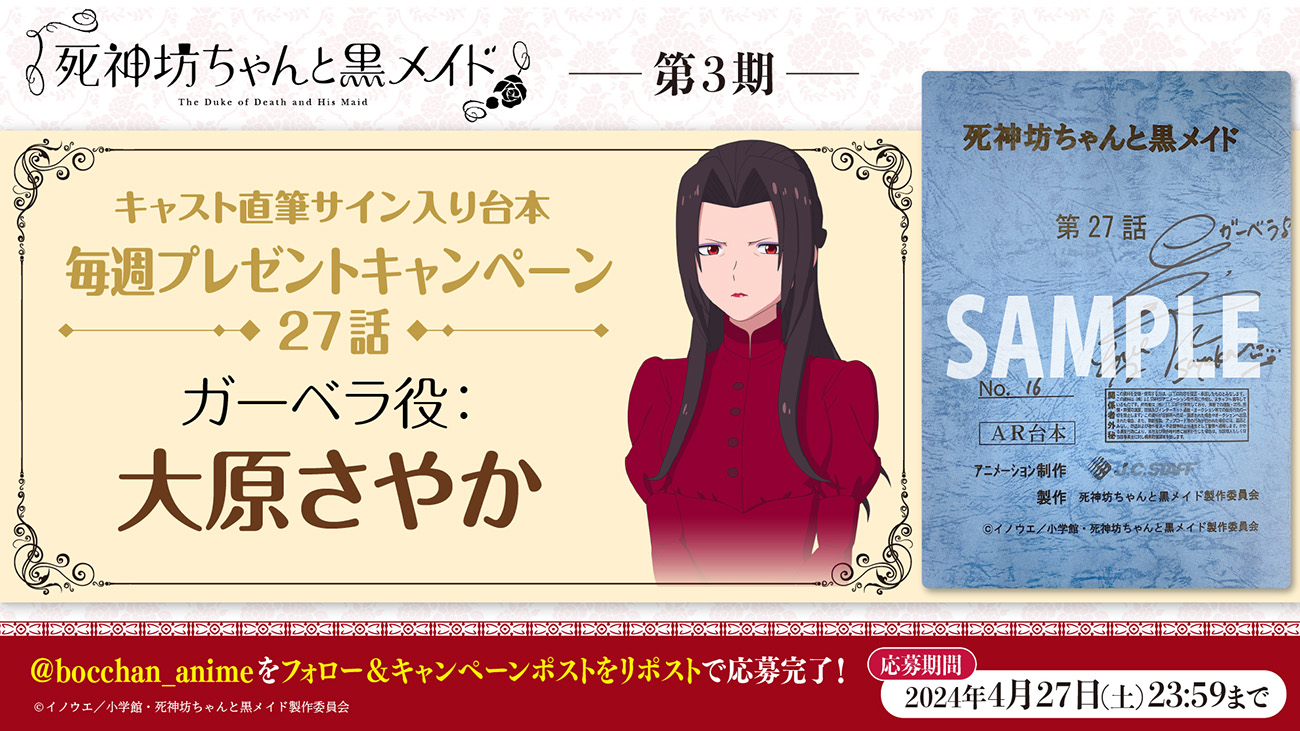 TVアニメ『死神坊ちゃんと黒メイド(第3期)』第3話(第27話)の放送を記念して、第27話のキャストサイン入り台本が当たるX(Twitter)フォロー&リポストキャンペーンを実施します!貴重なアイテムが手に入るチャンスをお見逃しなく!