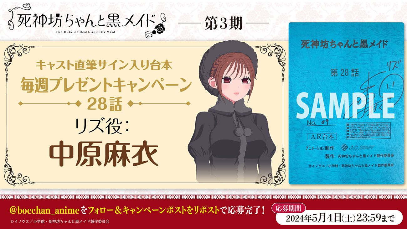 TVアニメ『死神坊ちゃんと黒メイド(第3期)』第4話(第28話)の放送を記念して、第28話のキャストサイン入り台本が当たるX(Twitter)フォロー&リポストキャンペーンを実施します!貴重なアイテムが手に入るチャンスをお見逃しなく!