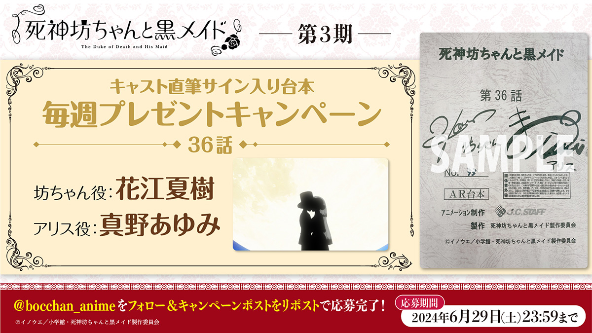 TVアニメ『死神坊ちゃんと黒メイド(第3期)』第12話(第36話)の放送を記念して、第36話のキャストサイン入り台本が当たるX(Twitter)フォロー&リポストキャンペーンを実施します!貴重なアイテムが手に入るチャンスをお見逃しなく!